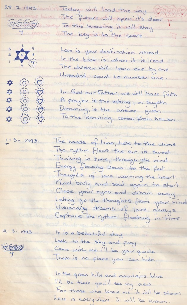 Now when I look at the writing it’s like I’m unraveling in my mind the journey I was taken on in my N.D.E. and all that was shown to me past, present and future, the feeling and actions I felt and the knowing of things to come.
